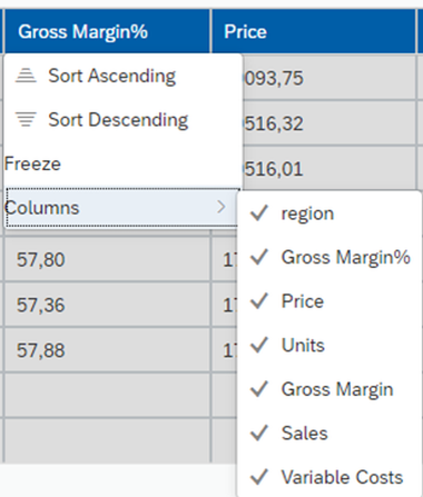 Weiterhin sind auch direkte Interaktionen mit der Tabelle möglich, wie zum Beispiel Sortieren oder Ein-/Ausblenden oder verschieben von Spalten.
