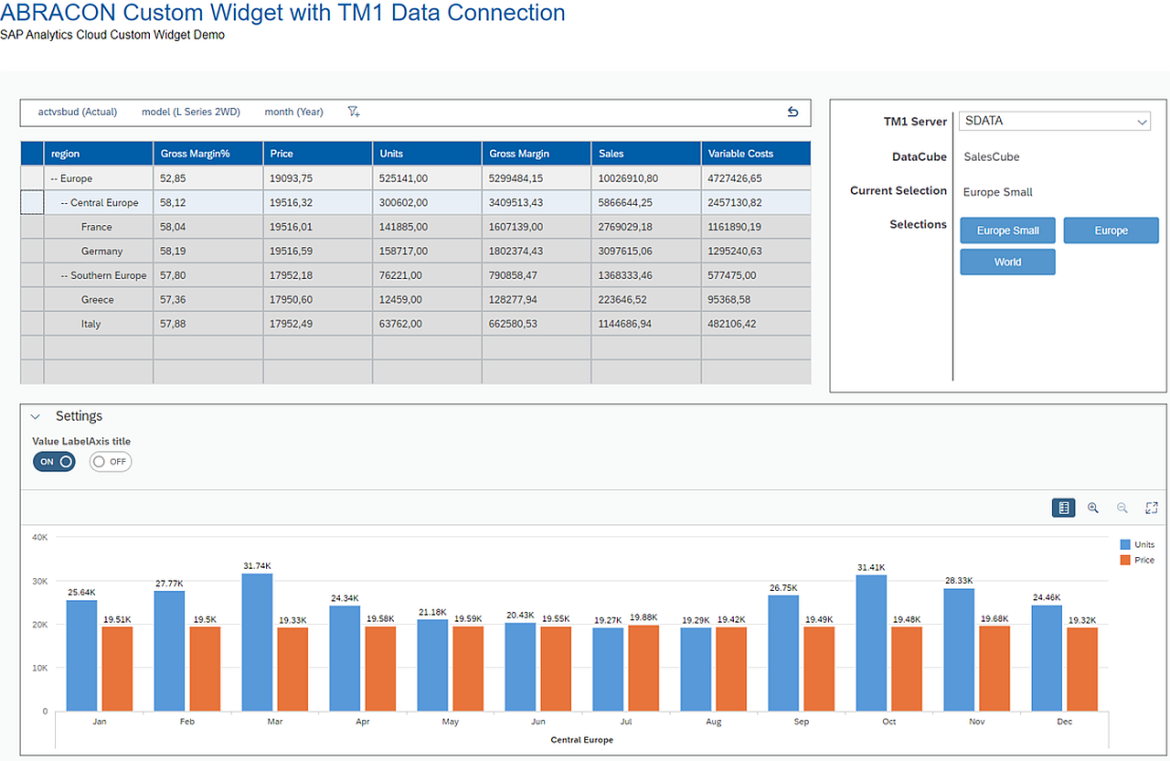 Da es sich auch hier um ein Custom Widget der SAC handelt, kann es nahtlos in jeder SAC Analytic Application eingesetzt werden und wie die oben genannte ABRACON TM1 (Grid) Table mit anderen SAC-Widgets interagieren.