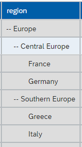 Die ABRACON TM1 (Grid) Table wird genutzt, um TM1-Daten tabellarisch darzustellen. Bereits hier können die einzelnen Elemente einer Dimension mit Hierarchie entsprechend eingerückt visualisiert werden.