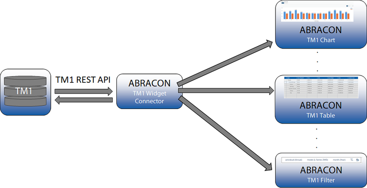 Der ABRACON TM1 Widget Connector, der als eine Art Mediator zwischen der SAC und TM1 Welt dient, ist in der Lage Daten direkt über die TM1 REST API abzurufen und bietet so vollständige Flexibilität der Datenanfragen gegen die TM1.