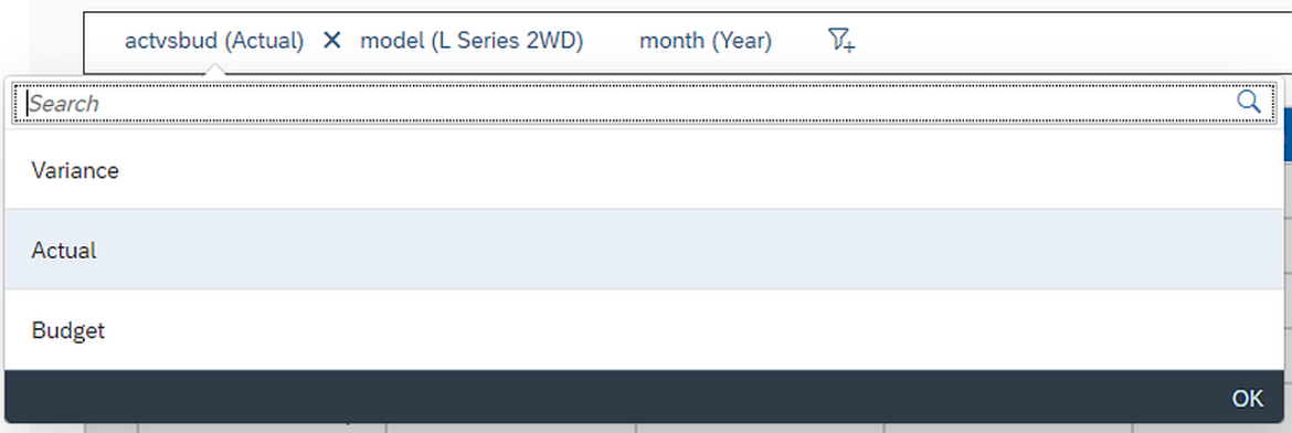 Innerhalb der Auswahlliste bietet ein Search-As-You-Type eine einfache und schnelle Suche von Members in der jeweiligen Dimension an. Über Maus-Klick-Events lassen sich dann die ausgewählten Members an die SAC Application weitergeben und somit filtern.